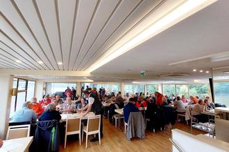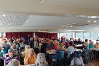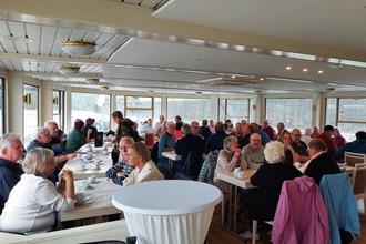 Bereits die Anreise mit sieben komfortablen Reisebussen der Firma Bohr verlief wie gewohnt professionell und reibungslos. Nach Ankunft in der „Mainmetropole“ stand zunächst eine gemütliche Schifffahrt auf dem Programm. Trotz regnerischem Wetter ließen sich die Teilnehmerinnen und Teilnehmer die Laune nicht verderben. Vom Wasser aus bot sich ein beeindruckender Blick auf die markante Skyline Frankfurts – mit ihren modernen Wolkenkratzern und historischen Bauwerken eine eindrucksvolle Kulisse. An Bord wurde den Gästen Kaffee und Kuchen serviert und alle nutzten die Zeit zum Genießen und Plaudern mit alten und neuen Bekannten.