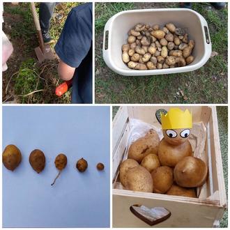 Im Frühjahr setzten die jetzigen Erstklässler, die alten Schlauen Hasen, Kartoffeln in ihrem Garten. Täglich wurde nachgesehen, ob sich Kartoffelkäfer angesiedelt haben, da sie die Ernte gefährden könnten. Zum Glück lief alles glatt, so dass nun die neuen Schlauen Hasen die Kartoffeln Anfang Oktober ernten konnten.