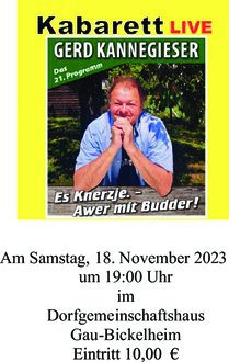 nach den ereignisarmen „Coronajahren“ wollen wir auch der Kulter in unserem Ort wieder etwas mehr Platz und Raum geben. Neben den Auftritten des Zettel’s Theater und den Leseabenden der KÖB werden wir auch wieder den einen oder anderen Künstler zu uns einladen und Ihnen damit ein weiteres kulturelles Angebot unterbreiten. Den Anfang macht der sicherlich noch vielen bekannte Kabarettist Gerd Kannegießer, der am Samstag, 18. November 2023, um 19:00 Uhr im Dorfgemeinschaftshaus auftreten wird.