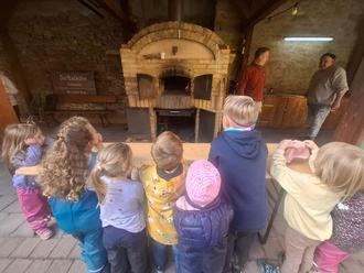 Pünktlich zur Frühstückszeit erreichten wir die erste Zwischenstation. Die gut gefüllten Frühstücksdosen wurden ausgepackt und es wurde herzhaft zugelangt. Gut gestärkt erkundeten wir das Innere der Kirchenruine. Krähen, alte Türen und geheimnisvolle Bodentüren wurden entdeckt. Um im Zeitplan zu bleiben, packten wir nun wieder die Rucksäcke zusammen und marschierten weiter zum Strandpfad der Sinne, wo uns die großen Findlinge zum Klettern einluden. Die Kinder kletterten rauf und runter, sprangen, rutschten und hatten jede Menge Spaß. Weiter ging es in die Dorfmitte von Eckelsheim, zum Dorfbackofen.