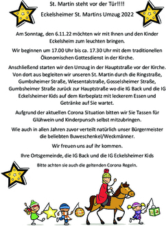 Von dort aus begleiten wir unseren St. Martin durch die Ringstraße, Gumbsheimer Straße, Wiesentalstraße, Gosselsheimer Straße, Gumbsheimer Straße zurück zur Hauptstraße, wo die IG Back und die IG Eckelsheimer Kids auf dem Kerbeplatz mit leckerem Essen und Getränke auf Sie wartet.