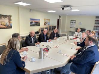 Das Mitglied des Deutschen Bundestages, Herr Jan Metzler, hat Ende Oktober die Verbandsgemeinde Wöllstein besucht. Nach dem offiziellen Empfang und der Begrüßung durch Bürgermeister Gerd Rocker, fand ein intensiver und offener Austausch zu den derzeit aktuellen Themen statt. Sehr offen wurden auch von Seiten des Bundestagsabgeordneten die Probleme und Themenkreise angesprochen, die viele Bürgerinnen und Bürger bewegen. Hierzu zählt die Flüchtlingsthematik, die Aufgabenstellungen und vor allem auch die Finanzierung der Klimaschutzmaßnahmen, der Fachkräftemangel und die gefühlt immer mehr ausufernde Bürokratie. Auch die Verwaltungen sind, aufgrund fehlenden Personals, zunehmend mit den Aufgabenstellungen überfordert. Nach diesem intensiven Austausch, fand ein Besuch der IG Therapeutisches Reiten auf der Reitanlage in Wonsheim statt. Hier empfing die 1. Vorsitzende des Vereines, Frau Dr. Susi Fieger die Delegation, und gab einen intensiven Einblick in die Organisation und Betrieb ihres Vereines. Im Anschluss daran hatte die Ortsgemeinde Wöllstein die Delegation zu einem gemeinsamen Mittagessen in den Nebenraum des Gemeindezentrums eingeladen. Ein herzliches Dankeschön geht an Herrn Ortsbürgermeister Brüchert für die gelungene Bewirtung. Nach dem Mittagessen wurde die Evangelische Sozialstation Wöllstein-Wörrstadt besucht. Hier konnten die Gesprächsteilnehmer Einblicke in die Tagespflege nehmen und im anschließenden Austausch mit den Verantwortlichen, Frau Herr, Frau Wagenführer und Frau Valerius, im Gespräch die Struktur der Evangelischen Sozialstation, die Aufgabenstellung und auch zu den Herausforderungen, welche diese wertvolle Einrichtung bewältigen muss, vieles erfahren. Bürgermeister Gerd Rocker bedankte sich bei Herrn Metzler für seinen Besuch und äußerte den Wunsch, dass die ein oder andere Anregung aus Wöllstein in Berlin Gehör findet. Auch Jan Metzler bedankte sich die freundliche Aufnahme und die Möglichkeit sich mit den politisch Verantwortlichen auszutauschen und auch Einblick in die besuchten Betriebe nehmen zu können.