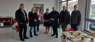 Gerd Rocker freute sich, die im Herbst eröffnete neue Mensa der betreuenden Grundschule Siefersheim "Am Martinsberg" vorstellen zu können. Ein heller Neubau, der sich locker an den Altbau aus den 60er Jahren anschließt. Eröffnung war im Herbst 2022. Die kleine Küche ist eine Verteilerküche zum Aufwärmen und zur Essensausgabe. 85 Kinder werden dort verköstigt, auch mit finanzieller Unterstützung des Landes.