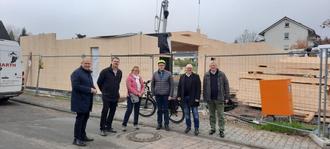 Die anschließende Besichtigungstour führte zur KITA "Grüne Wiese" in Gau-Bickelheim, einem Neubau in Vollholzbauweise, offiziell genehmigt für zwei Gruppen und finanziell unterstützt durch Land und Kreis. Baubeginn war Ende 2021, dann brannte das Gebäude im Juni 2022 fast zu Gänze ab. Die Versicherung habe den gesamten Schaden finanziell übernommen, so der Ortsbürgermeister. Nun steht der Rohbau wieder. Die Eröffnung ist Ende 2023 geplant.