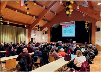 Rund 80 Bürgerinnen und Bürger nehmen an der Auftaktveranstaltung in der Gemeindehalle Wöllstein teil.