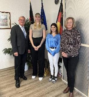 Die neuen Auszubildenden Maike Metzger und Melina Eich mit Bürgermeister Rocker und Tina Werner (stellv. Büroleiterin)