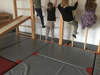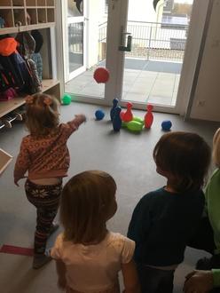 Es gab viele verschiedene Angebote. Im unteren Flur gab es einen großen Barfußpfad, im Turnraum war eine Bewegungsbaustelle zu finden, in der Pinguingruppe fanden musikalische Bewegungsspiele statt. Im oberen Stockwerk konnten die Kinder im Flurbereich Dosen werfen und Kegeln, sowie Tanzen im Sonnenraum.