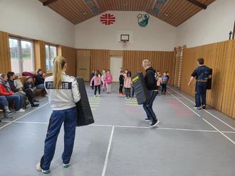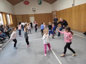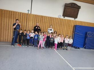 Am Freitag durften die Kinder der Kita an einer Kickbox-Schnupperstunde in der Sporthalle Wendelheim mit Sven Mager, Kiara Mager und Finn Mager von der Kampfsportschule „Kickboxing Team Kibo“ aus Kirchheimbolanden teilnehmen.