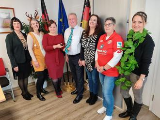 Die närrisch verkleideten Mitarbeiterinnen der Verwaltung ließen es sich nicht nehmen, das gute Stück Krawatte zu kürzen und nahmen das abgeschnittene Teil als „Trophäe“ mit.