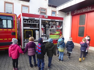 Zu Beginn stellten die Feuerwehrmänner sich und ihre schwere Ausrüstung im Kindergarten vor. Allen voran brachte die Atemschutzausrüstung die Vorschüler zum Staunen. Im Anschluss daran machten wir uns auf einen kurzen Fußweg zur Feuerwehrstation. Dort bekamen die Kinder eine Führung durch die Halle und einen genauen Blick auf die Ausstattung der Fahrzeuge.