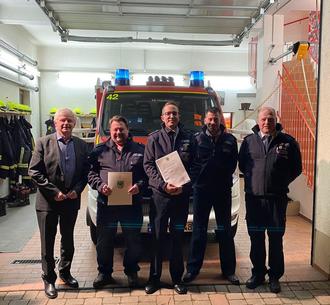 Von rechts nach links: Wehrleiter Andreas Steinborn, Wehrführer Martin Balz, stellvertretender Wehrführer Maximilian Merkel, der seitherige Stellvertreter Oliver Gardt und Bürgermeister Walter Wagner