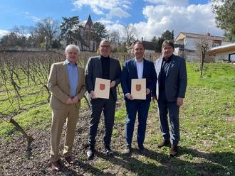 Landrat Heiko Sippel überreichte den Ortsbürgermeistern von Gundersheim, Joachim Mayer (2.v.l), und Bechtheim, Tobias Perlick (3.v.l.), im Beisein des VG-Bürgermeisters Wonnegau, Walter Wagner, zum Bau neuer Kindertagesstätten Bewilligungsbescheide in Höhe von insgesamt rund fünf Millionen Euro.