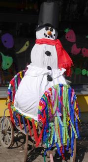 Vor dem Start wurden alle mit dem Lied „Komm`doch, lieber Frühling“ in Frühlingslaune gebracht. Dazu trug auch der farbenfrohe, selbstgebastelte Kopfschmuck der Kinder bei. Endlich ging es los und der bunte Zug folgte dem Schneemann durch die Gassen zur Skaterbahn. Dort wurde nach den Liedern „Immer wieder kommt ein neuer Frühling“ und „Im Garten steht ein Schneemann“ symbolisch der Schneemann verbrannt.
