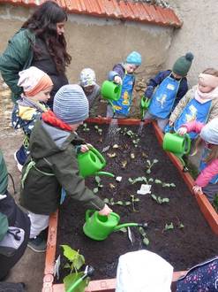 In dieser Woche haben die Vorschulkinder unser Gemüsebeet im Pfarrgarten bepflanzt. Begleitet wurde dieses Angebot auch in diesem Jahr wieder von zwei netten Vertreterinnen einer Supermarkt-Stiftung. Nach einer kurzen Theoriestunde ging es gleich „ran ans Werk“. Im Finger schmutzig machen sind unsere Vorschulkinder schließlich Profis! In Windeseile waren Karotten, Radieschen, Salat, Gurken, sowie Brokkoli und Blumenkohl gepflanzt und obwohl am Himmel schon der Regen nahte, ließen es sich die Kinder nicht nehmen, selbst noch die Bewässerung des Beetes durchzuführen.