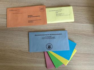 Im Prinzip wiederholt sich das Verfahren für die Kommunalwahlen. Die einzelnen Unterlagen werden hier farblich unterschieden. Die wahlberechtigten Bürgerinnen und Bürger bekommen einen gelben Wahlschein, einen blauen Stimmzettelumschlag, für jede einzelne Kommunalwahl unterschiedlich farblich gestaltete Stimmzettel und einen orangefarbenen Wahlbriefumschlag. Auch hier ist das Verfahren identisch. Nach der Kennzeichnung der Stimmzettel sind diese in den blauen Stimmzettelumschlag zu legen; nach dessen Verschluss ist der vom Wahlberechtigten unterzeichnete Wahlschein getrennt davon in den orangenen Wahlbriefumschlag zu stecken, zuzukleben und kostenfrei an die Verwaltung zu versenden.