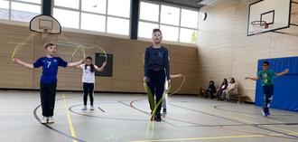 Am 03.06.24 kam dann Coach Jana Niederauer zu einem Workshop nach Westhofen, um den Kindern der Klasse 3c rope skipping, also sportliches Seilspringen, näherzubringen. Die Schüler*innen bekamen tolle Tricks mit der skipping rope gezeigt, z.B. den „forward straddle“ oder den „skier“. Am eindrucksvollsten war ein Sprung mit integrierter Liegestütze, den alle Kinder meistern konnten. Am Ende zeigte Coach Jana noch eine tolle Show mit fortgeschrittenen Tricks, welche die Kinder zum Staunen brachte.