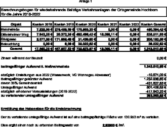 Auf der Grundlage der jährlichen Investitionsaufwendungen für die die Abrechnungseinheit bildenden Verkehrsanlagen der Gemeinde Hochborn für den Zeitraum von 2018 bis 2022 wird der sich aufgrund der Anlage 1 errechnende noch zu erhebende Beitragssatz der wiederkehrenden Beiträge für Verkehrsanlagen in Höhe von 2,92903 €/m² gewichtete Grundstücksfläche wie folgt festgelegt: