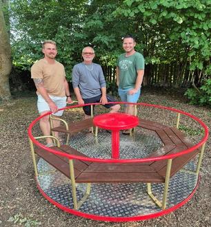 Mit Begeisterung haben unsere Kinder das komplett überarbeitete Kinderkarussell auf dem Spielplatz wieder in Betrieb genommen. Danke an die fleißigen Freiwilligen Klaus-Peter Blum (re.), Kevin Lang (li.), Oliver Sann und Frank Karlinowski (jeweils nicht auf dem Foto), sowie Werner Renz und Engelbert Michel (ebenfalls nicht auf dem Foto) für die Herrichtung des Karussells. Ein herzliches Dankeschön geht ebenfalls an Hilmar Osadschy (Bild mitte) von der gleichnamigen Schlosserei Osadschy, der das gesamte Material und seine zahlreichen Arbeitsstunden ebenfalls für die Gundheimer Kinder gespendet hat.