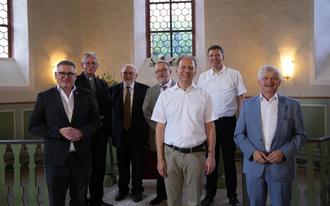 Präses Alexander Ebert, Domprobst Tobias Schäfer, Pfarrer Rolf Claußnitzer, Dekan Harald Storch, Ortsbürgermeister Ansgar Münnemann, Pfarrer Andreas Schenk und Bürgermeister Walter Wagner in der evang. Kirche in Monzernheim