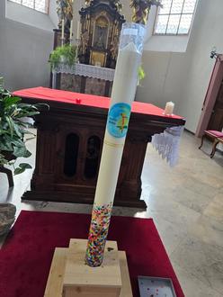 Die Pilgerkerze des neu zu gründenden Pastoralraums war in der vergangenen Woche zu Gast in Osthofen. Hier trafen sich Kinder der beiden Caritas-Kitas „Regenbogen“ und „Arche Noah“ gemeinsam in der kath. Kirche zu einer kleinen Andacht.