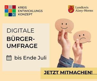 Alzey-Worms die Möglichkeit, ihre Ideen und Anregungen in das Kreisentwicklungskonzept einzubringen. Durch das Kreisentwicklungskonzept, kurz KEK, soll ein Rahmen für die zukünftige Entwicklung des Landkreises gesetzt werden. Bereits mehr als 470 Personen haben die Chance genutzt und den Fragebogen ausgefüllt. Die Befragung umfasst Themen wie Mobilität, Nahversorgung, Kultur- und Freizeit angebote sowie Naturschutz.
