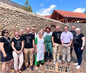 Delegation der Lauterbacher Stadtverordneten (dunkelblaue Shirts) sowie Ilse Weinreich (Heimatverein), Manfred Buscher (Organisator Partnerschaft Lauterbach), Tobias Perlick (Bürgermeister)