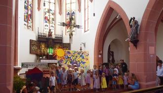 Zum Auftakt unseres Sommerfestes gestalteten die Kinder unserer Kita einen Familiengottesdienst. Gespielt wurde die Geschichte „Moa und der Wunschbaum“. Das Bühnenbild dazu wurde gemeinsam von den Kindern und der Künstlerin Katinka Eichhorn gestaltet und wird zum aktuellen Zeitpunkt noch in der Kirche ausgestellt.