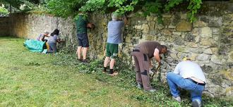 Die Anpackgruppe beim Entfernen des Efeus an der Wand und des Unkrauts im Sand auf dem Spielplatz. Nach dem Einsatz auf dem Theodo-Authilt-Platz konnte man beim Imbiss nur fröhliche und zufriedene Gesichter sehen.