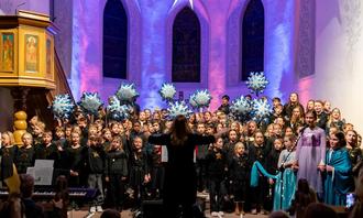 Die Chorkinder der dritten und vierten Klassen starteten direkt mit ihrem musikalischen „Feuerwerk“. Sie erzählten vom Glück der Weihnachtszeit, stellten aber auch die nicht immer einfache Frage nach der richtigen Kleidung beim winterlichen Schmuddelwetter.