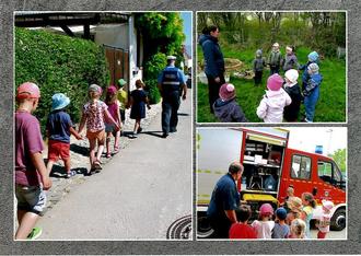Das Vorschuljahr endete mit dem Besuch der freiwilligen Feuerwehr in Monzernheim. Dort wartete Wehrführer Herr Kratz auf die Schulanfänger. Im Gerätehaus erkundeten sie das Feuerwehrauto, durften Probesitzen und Herr Kratz zeigte den Kindern, welche Kleidung und Ausrüstung ein Feuerwehrmann benötigt. Abschließend wurde jedem Kind eine Urkunde überreicht.