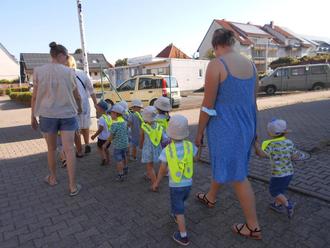 Am Freitag sind wir, die Gelbe Gruppe, zum Spielplatz in der Taunusstraße gelaufen. Auf dem Weg von der Kita zum Spielplatz lauern viele verschiedene Gefahren, wie zu schnell vorbeifahrende Autos, Baustellen oder Kreuzungen. Diese müssen wir gemeinsam überwinden. Gerade Verkehrsteilnehmer, können uns und die Kinder da schnell übersehen. Damit wir uns sicher im Straßenverkehr bewegen können, haben wir unsere neuen Warnwesten angezogen. Diese können die Kinder eigenständig anziehen. Sie sind neon-gelb und reflektieren. Mit diesen Westen sind wir sicher im Straßenverkehr unterwegs.
