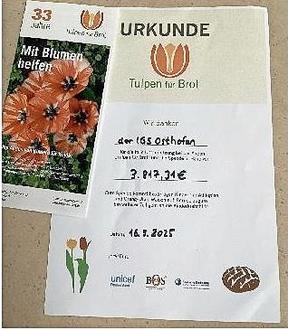 Verkauf und Kauf von Tulpenzwiebeln in der Nachbarschaft und Verwandtschaft erleben Schülerinnen und Schüler unmittelbar, dass Helfen Spaß macht und Gemeinschaftssinn fördert. Besonders die Klassen jetzigen Klassen 7a, 6a und 6c waren „Topseller“ mit 1291,50€, 777€ und 595€. Das durch den Verkauf von Tulpenzwiebeln gesammelte Geld geht an die deutsche Kinderkrebshilfe, die Welthungerhilfe und eine Orangutan Auffangstation in Borneo. Tun auch Sie was Gutes und unterstützen Sie mit dem Kauf von Tulpenzwiebeln diesen wertvollen Einsatz für eine bessere Welt! R. Herd