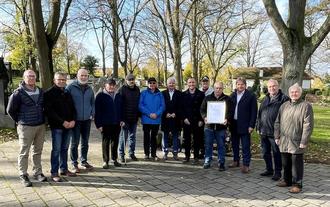 Landrat Heiko Sippel betonte bei der Ehrung das besondere Ambiente des Friedhofs: „Nicht nur bei golden herbstlichem Wetter so wie heute findet man hier seine Ruhe. Die parkähnliche Anlage mit altem Baumbestand ist eine außergewöhnliche Erinnerungs- und Begegnungsstätte.“ Und das dank der ehrenamtlich Aktiven.