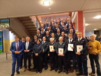 Landrat Sippel, Bürgermeister Wagner und Wehrleiter Steinborn mit den geehrten Feuerwehrkameradinnen und Feuerwehrkameraden