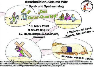 Unter dem Titel „Das Oster-Quartett“ sind am 18. März Kinder von 6-11 Jahren zum "Asselmühlen-Kids mit Witz" Spiel- und Spaßsamstag ins Evangelische Gemeindehaus in Asselheim eingeladen. Von 9:30-12:00 Uhr erwarten die Kinder in der Ostergasse 6 vier Stationen mit Spiel, Basteln, biblischen Geschichten und mehr zur Passions- und Ostergeschichte. Die Veranstaltung der Prot. Kirchengemeinden Asselheim-Albsheim-Mühlheim und Colgenstein-Obrigheim in Kooperation mit der Evangelischen Jugendzentrale Grünstadt ist kostenfrei. Eine Anmeldung ist nicht erforderlich. Weitere Informationen bei Petra Ludwig Telefon 06359-949058 oder www.juz-duewgruen.de/Angebote für Kinder.