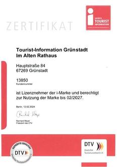 Der Deutsche Tourismusverband e.V. (DTV) hat die Tourist-Information Grünstadt wieder offiziell mit der i-Marke ausgezeichnet. Das rote Hinweisschild mit dem charakteristischen „i“ für Informationsstelle führt Urlauber auf schnellstem Wege zu der vorbildlichen Tourist-Information. Alle drei Jahre wird eine erneute Prüfung vorgenommen.
