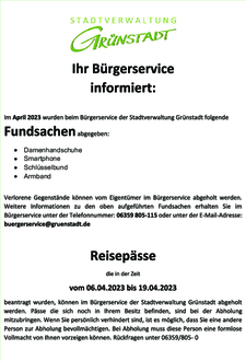 Im April 2023 wurden beim Bürgerservice der Stadtverwaltung Grünstadt folgende Fundsachen abgegeben: