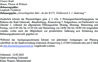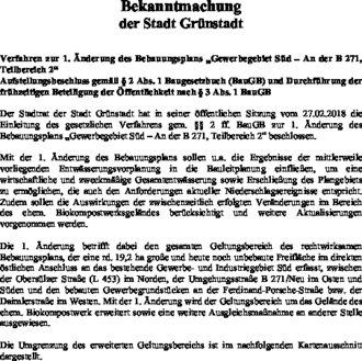 Der Stadtrat der Stadt Grünstadt hat in seiner öffentlichen Sitzung vom 27.02.2018 die Einleitung des gesetzlichen Verfahrens gem. §§ 2 ff. BauGB zur 1. Änderung des Bebauungsplans „Gewerbegebiet Süd – An der B 271, Teilbereich 2“ beschlossen.