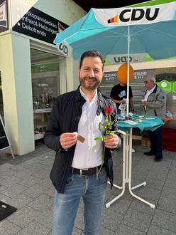 Rosen für die Damen - der CDU Ortsverband Grünstadt-Asselheim-Sausenheim präsentierte sich am 10.05.2025 in der Grünstadter Fußgängerzone. Die Damen erhielten zum Muttertag bunte Rosen geschenkt. Verteilt wurden auch 300 kleine Dubbeglas-Modelle aus Gips mit einer Einladung zum CDU-Dämmerschoppen am 15.05.2025 auf dem Carrières-sur-Seine-Platz.