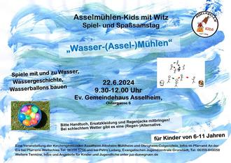 Kinder von 6-11 Jahren sind eingeladen, am 22. Juni zu dem „Asselmühlen-Kids mit Witz" Spiel- und Spaßsamstag in Asselheim zu kommen. Von 9:30-12:00 Uhr dreht sich alles rund ums Thema Wasser: Wasserspiele, eine Wassergeschichte, Wasserbälle basteln uvm.