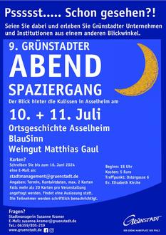 Zum neunten Mal organisiert die Stadtverwaltung Grünstadt einen Abendspaziergang, der zum ersten Mal in Asselheim stattfindet. Das beliebte Veranstaltungsformat stellt Firmen und Einrichtungen aus unterschiedlichen Branchen vor, die ihre Türen für interessierte Bürgerinnen und Bürger öffnen, um diesen einen Einblick in ihr Unternehmen zu geben.