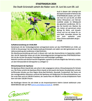 Die Stadt Grünstadt sattelt die Räder vom 19. Juni bis zum 09. JuliAuch in diesem Jahr schwingt sich die Stadt Grünstadt im Rahmen des STADTRADELNS wieder auf‘s Fahrrad: Vom 19. Juni bis 09. Juli 2024 stehen Klimaschutz und Fahrradmobilität wieder im Mittelpunkt des gesamten Landkreises. Wir laden Sie herzlich ein: Machen Sie mit, leisten wir gemeinsam einen Beitrag für Klima- und Umweltschutz und tun wir etwas für unsere Stadt. Anmelden können Sie sich auch weiterhin unter https://www.stadtradeln.de/gruenstadt