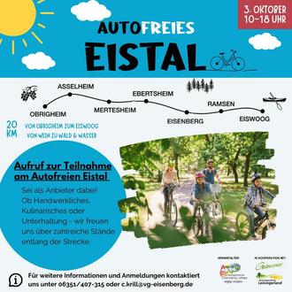Am Freitag, den 3. Oktober, findet zwischen 10 und 18.00 Uhr wieder das Autofreie Eistal zwischen dem Eiswoog und Obrigheim statt. Für Kraftfahrzeuge ist die Strecke in dieser Zeit gesperrt.