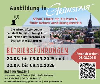 Nach einem erfolgreichen Projektstart im Jahr 2024 mit „Ausbildung in Grünstadt -Schau‘ hinter die Kulissen und finde deinen Ausbildungsbetrieb“ geht es direkt nach den Sommerferien in die nächste Runde.