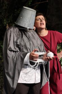 Und sie ist bei den Burgspielen in besten Händen. Allen voran Titelheldin "Lysistrata", die - von Anja Gößling hervorragend interpretiert - die Fäden in der Hand hält. Sie motiviert die anfangs noch zögernden Mitstreiterinnen Kalonike und Myrrhine (wunderbar abwechslungsreich dargestellt von Helena Klingler und Stella McColgan) und andere Frauen, sich Ihrem Plan anzuschließen. Als dann auch noch die Spartanerinnen mit im Boot sind, angeführt von Lampito (natürlich und stark von Ute Schmitt gespielt), kommen die Herren der Schöpfung in beiden Kriegsparteien unter gehörigen, auch körperlichen Druck.