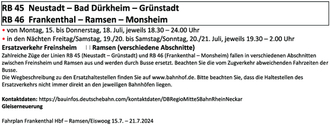 Zahlreiche Züge der Linien RB 45 (Neustadt – Grünstadt) und RB 46 (Frankenthal – Monsheim) fallen in verschiedenen Abschnitten zwischen Freinsheim und Ramsen aus und werden durch Busse ersetzt. Beachten Sie die vom Zugverkehr abweichenden Fahrzeiten der Busse.