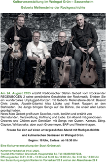 Am 24. August 2025 erzählt Radiomacher Stefan Gebert vom Rocksender REGENBOGEN 2 seine persönliche Geschichte der Rockmusik. Erleben Sie ein wunderbares Unplugged-Konzert mit Geberts Meilensteine-Band: Bassist Chris Linder, Akustik-Gitarrist Alex Lützke und Frank Ruppert an den Stahlsaiten. Die Jungs bringen Songs auf die Bühne, die unser aller Leben geprägt haben.