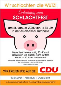 Der CDU-Ortsverband Grünstadt-Asselheim-Sausenheim lädt am 25.01.2025 zum traditionellen Schlachtfest in die Asselheimer Turnhalle ein.