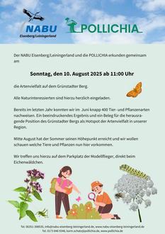 Am Sonntag, den 10. August zwischen 11 und 16:00 Uhr möchte sich die NABU-Gruppe Eisenberg/Leiningerland und die Pollichia Donnersbergkreis an der Aktion „Tag der Artenvielfalt“ beteiligen. Es werden alle Naturfreunde aufgerufen, innerhalb eines selbst festgelegten Gebietes möglichst viele Tier- und Pflanzenarten zu entdecken.
