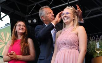 Bürgermeister Klaus Wagner krönt die neue Weingräfin 2024/25, Sarah I. aus Obrigheim.